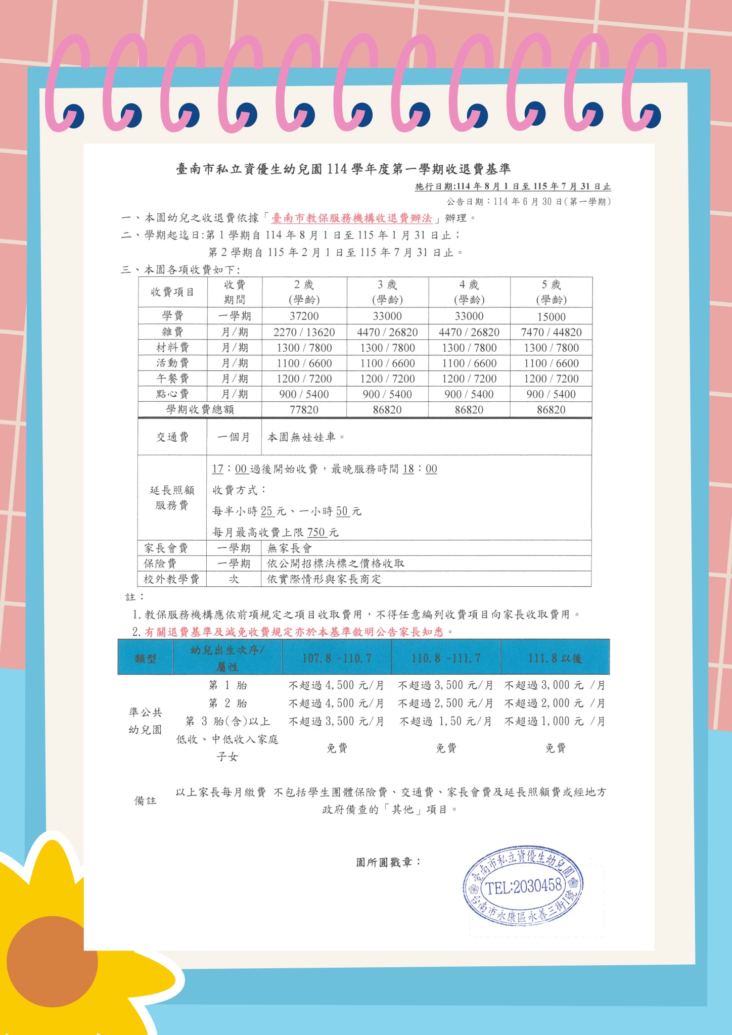 114學年度第一學期臺南市私立資優生幼兒園收費標準