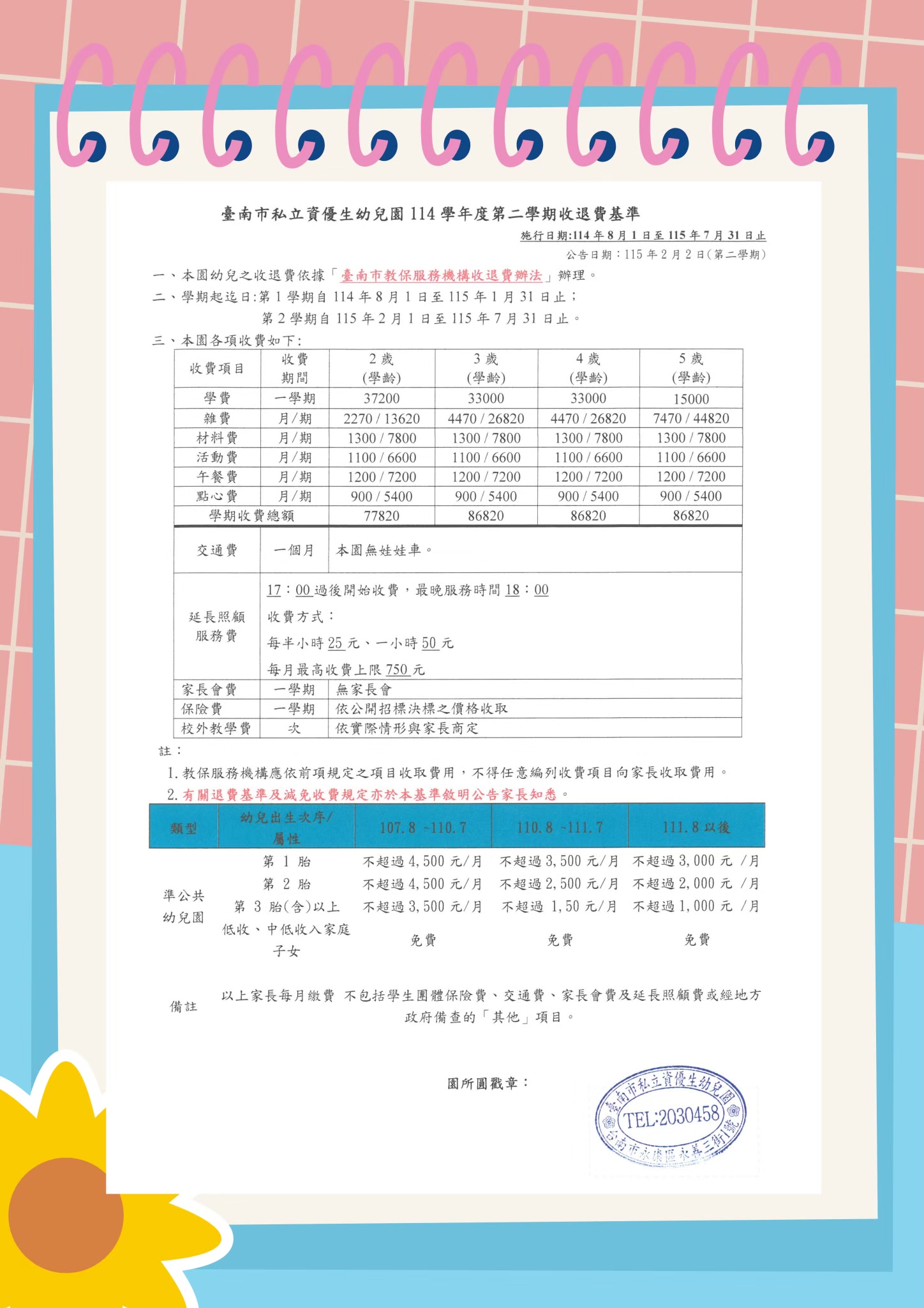 114學年度第二學期臺南市私立資優生幼兒園收費標準